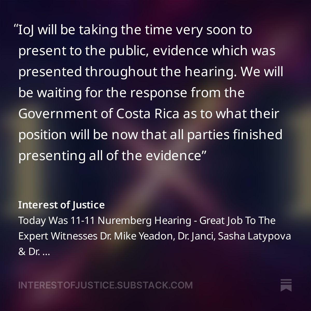 Elsewhere, Interest of Justice update us on the progress at their "Nuremberg hearing" in Costa Rica against the WHO and its spurious powers to push malignant injections on populations around the world - to the massive benefit of their backers in Big Pharma.
